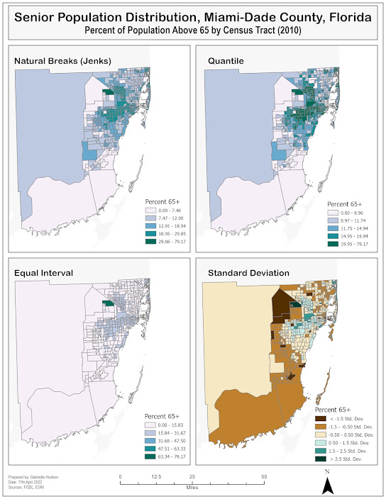 - Natural Breaks - classes based on naturally occurring breaks in the data.